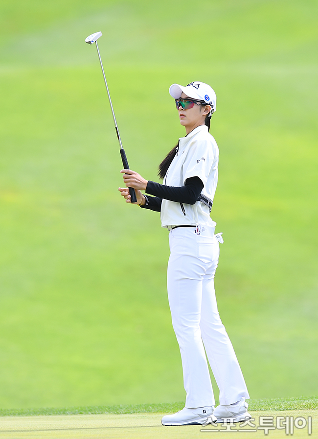 [충주(충북)=스포츠투데이 팽현준 기자] 27일 충북 충주 킹스데일GC에서 열린 KLPGA 덕신EPC 챔피언십 파이널라운드, 강지선이 1번홀 그린에서 퍼팅을 하고 있다. 2025.04.27.