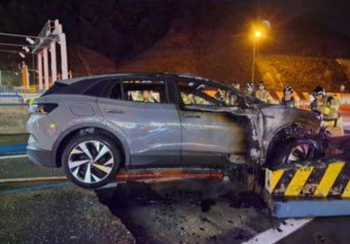 경기도소방재난본부는 27일 오전 1시 14분쯤 용인시 수지구 용인서울고속도로 서울 방향 서수지톨게이트 부근에서 연석을 들이받은 전기차에서 불이 났다고 밝혔다.