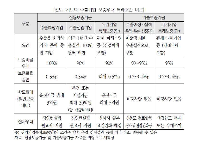 하지만 예산정책처는 위기기업특례보증이 기존의 수출기업 보증우대과 비교해 혜택이 크지 않다고 지적했다. 신보는 연간 수출실적이 100만 달러 미만인 수출 진입 기업의 경우 최고 매출액의 25~50% 한도내에서 최대 30억원, 보증비율 90% 상향, 보증료 최고 0.3%p 할인 등의 혜택을 제공하고 있다. 기보도 전년도 매출액 대비 수출실적에 따라 90~95% 수준의 보증비율 상향 우대, 0.2~0.4%p의 보증료 감면, 신용도 검토 항목 심사 및 전결 완화 등의 혜택을 주고 있다.