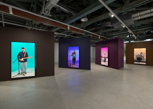 (부산=연합뉴스) 황희경 기자 = 지난 25일 부산 수영구의 F1964 내에 있는 국제갤러리 부산점. 전시장에 들어서자 느릿한 블루스 음악이 귀에 들어온다. 실제 사람 크기의 스크린에서는 콘트라베이스, 보컬, 색소폰, 오르간, 드럼을 연주하는 이들의 연주 모습이 상영된다. 이들이 내는 소리는 완벽한 화음은 아니지만 그렇다고 또 불협화음은 아닌 상태로 섞이며 전시장을 채운다. 작가 정연두의 개인전 '불가피한 상황과 피치 못할 사정들'의 전시 모습이다.