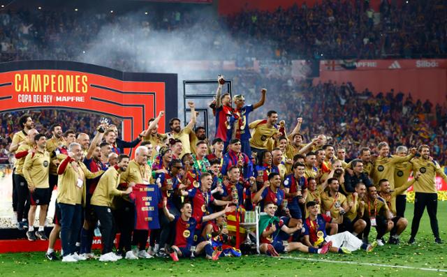 FC바르셀로나 선수단이 27일(한국시간) 스페인 세비야의 에스타디오 올림피코 라 카르투하에서 열린 레알 마드리드와의 2024~25시즌 국왕컵 결승전에서 연장전 끝에 3-2로 승리, 우승을 확정한 뒤 기뻐하고 있다. 세비야=로이터 연합뉴스 |