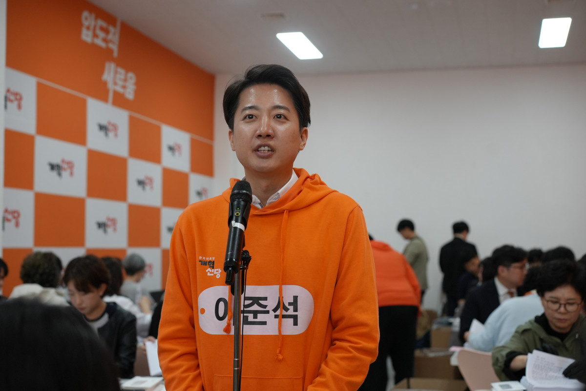 이준석 개혁신당 대선 후보가 27일 서울 강남 캠프에서 홍보물 봉입 행사를 진행하고 있다.