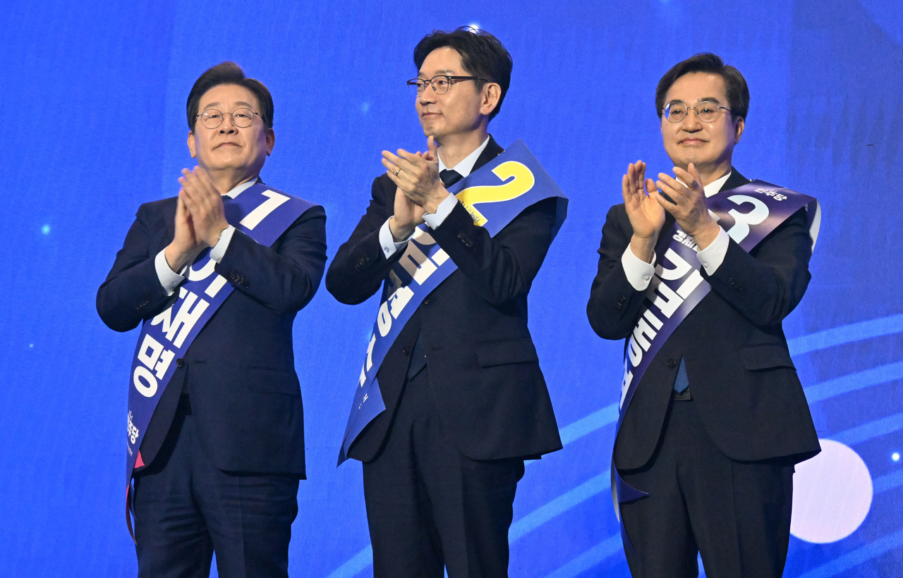 더불어민주당 이재명(왼쪽부터)·김경수·김동연 대선 경선 후보가 27일 경기 고양시 킨텍스에서 열린 ‘제21대 대통령선거 후보자 선출을 위한 수도권·강원·제주 경선 및 최종 후보자 선출 대회’에서 박수를 치고 있다. [공동취재][연합] |