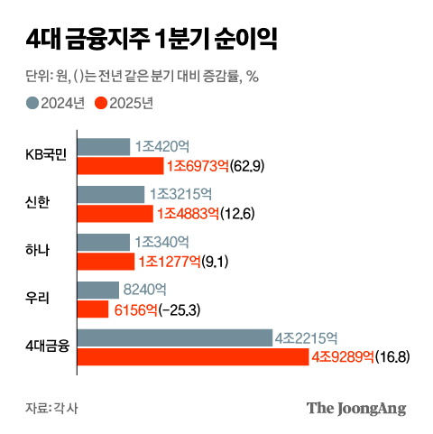 27일 금융권에 따르면 4대 금융그룹은 지난 1분기 합산 순이익은 4조9289억원으로, 지난해 같은 분기(4조2215억원)보다 16.8% 증가했다. KB금융의 순이익이 지난 1분기 1조6973억원을 기록하면서 1년 전보다 62.9% 급증했다. 신한금융과 하나금융도 같은 기간 각각 12.6%, 9.1% 많은 순이익을 거두면서 1분기 역대 최대 실적을 경신했다. 4대 금융 중에선 우리금융 순이익이 25.3% 감소해 유일하게 역성장했다. 이자이익은 늘었지만 증권사 출범 등으로 인한 일회성 비용이 늘어난 영향이다.