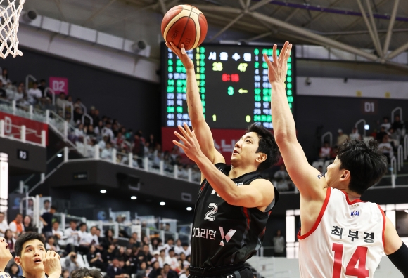 수원 kt 허훈이 27일 수원 케이티아레나에서 열린 2024~25 프로농구 4강 플레이오프 3차전 서울 SK와의 홈 경기에서 레이업하고 있다. 연합뉴스 |