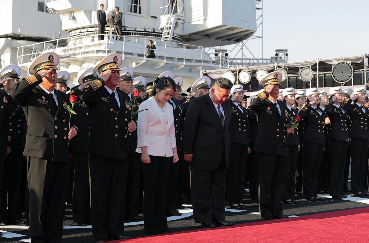 북한 김정은 국무위원장과 딸 김주애가 지난 25일 남포조선소에서 열린 5,000t급 신형다목적구축함 ‘최현호’ 진수식에 참석해 있다. 노동신문 뉴스1 |