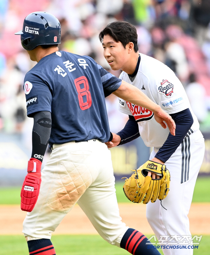 27일 잠실야구장에서 열린 롯데와 두산의 경기, 두산이 13대4로 승리했다. 경기 종료 후 9회초 사구로 1루에 나갔던 롯데 전준우가 사구를 던진 두산 김민규를 격려하고 있다. 잠실=허상욱 기자 |