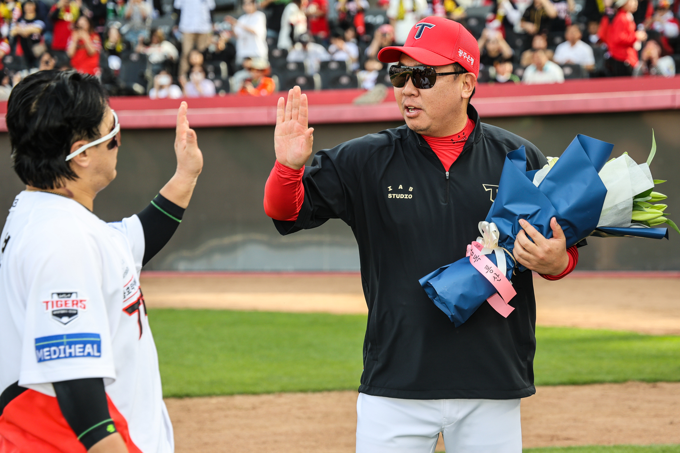 이범호 KIA 타이거즈 감독(오른쪽)이 개인 통산 100승을 달성했다. (KIA 타이거즈 제공) |