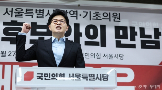 한동훈 국민의힘 대선 경선 후보가 27일 오후 서울 여의도 국민의힘 서울시당에서 열린 국민의힘 서울 광역·기초의원 간담회에서 발언하고 있다. 2025.4.27/사진=뉴스1 /사진=(서울=뉴스1) 신웅수 기자 |