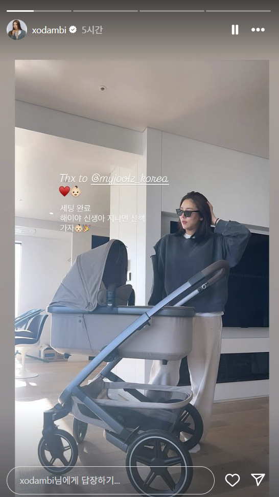 손담비는 27일 자신의 사회관계망서비스(SNS)에 유모차 옆에서 찍은 자신의 사진을 공개, "세팅 완료, 해이야 신생아 지나면 산책 가자"라는 문구를 함께 적으며 들뜬 마음을 드러냈다.