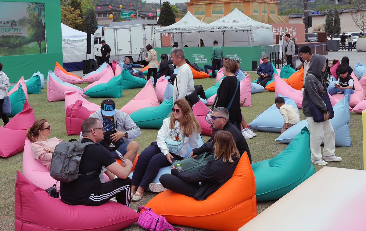 포근한 날씨를 보인 27일 서울 광화문 광장에 마련된 서울야외도서관 광화문책마당을 찾은 외국인 등이 여유로운 시간을 보내고 있다. 뉴스1 |