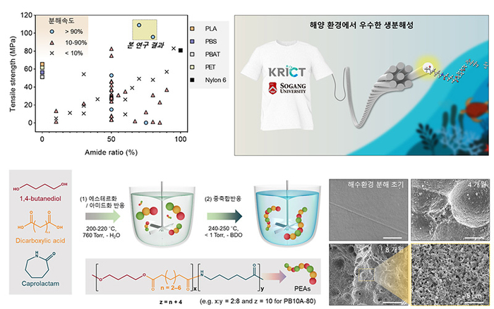 기존 생분해성 플라스틱은 잘 분해되지만 내열성·내구성이 떨어져, 의류·어망에 적용하기엔 쉽지 않았다. 공동 연구팀은 생분해를 촉진하는 에스터(ester), 질긴 특성을 갖는 아마이드(amide)를 최적의 비율로 결합한 PEA 고분자를 개발해 높은 분해성과 내구성을 동시에 확보했다.