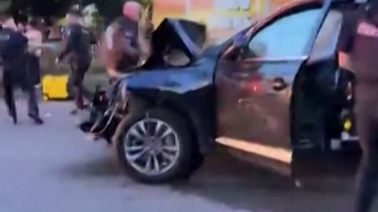 앞부분이 심하게 부서진 검은색 SUV 차량이 도로 한가운데 멈춰 서있습니다.