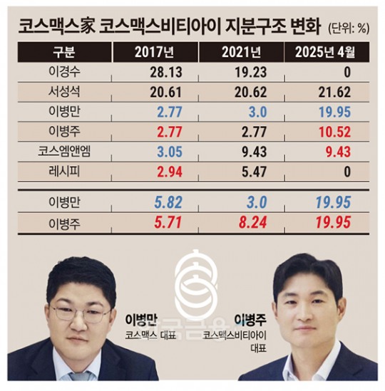 직접 지분만 보면 이병만 대표가 앞서나 코스엠앤엠을 통한 우회지분까지 감안하면 두 사람의 지주사 코스맥스비티아이에 대한 실질 영향력은 19.95%로 같다.