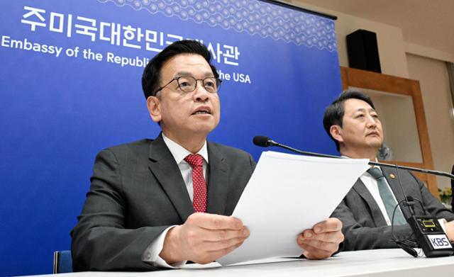 최상목(왼쪽) 부총리 겸 기획재정부 장관이 안덕근 산업통상자원부 장관과 함께 24일 미국 워싱턴DC 주미대사관에서 한미 2+2 통상협의(Trade Consultation) 관련 합동브리핑을 하고 있다. 기획재정부 제공 |