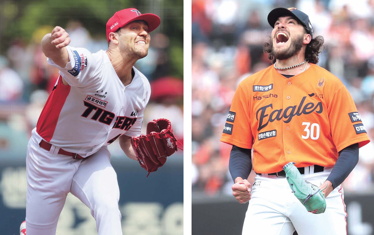 외인 2인방 명품 투구 KIA 투수 제임스 네일이 27일 광주 기아챔피언스필드에서 열린 2025 KBO리그 LG와 홈 경기에 선발 등판해 역투하고 있다. 오른쪽 사진은 한화 투수 코디 폰세가 KT와 홈 경기에 선발 등판해 상대 타자를 막은 뒤 환호하는 모습. 광주=연합뉴스·한화 이글스 제공 |