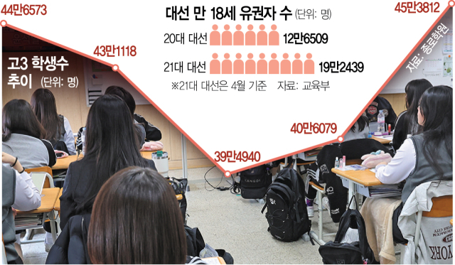 변수는 투표율이다. 지난 2019년 공직선거법이 개정돼 선거권 연령이 만 19세에서 18세로 조정되면서 학생 유권자는 지난 20대 대선에 처음으로 참여했는데, 투표율은 71.3%로 20대(71.0%)·30대(70.7%)보다 다소 높았다. 대통령 파면으로 치러지는 대선이고 유권자 증가에 투표 참여 성향도 강한 만큼 20대 대선보다 투표율이 높아질 수 있다는 것이 중론이다. 교육계 관계자는 “국회의 대통령 탄핵, 헌법재판소의 대통령 파면 결정 등을 보면서 학생들은 민주주의 의미 등을 체득했다"며 “자신의 권리를 행사할 수 있는 대선을 쉽게 생각하지 않을 가능성이 크고 학생 수도 늘어난 만큼 투표하는 학생이 지난 대선 대비 늘어날 것으로 보인다”고 짚었다.