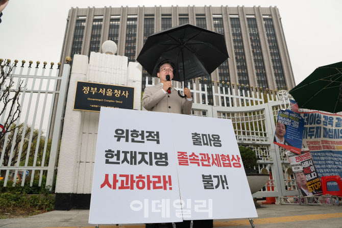 김민석 더불어민주당 최고위원이 18일 오전 서울 종로구 정부서울청사 앞에서 한덕수 대통령 권한대행 대선 출마 여부 및 윤어게인 신당 관련 입장 표명 요구 기자회견을 하고 있다.(사진=뉴스1) |