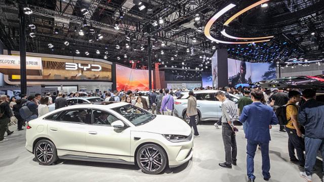 23일 '2025 오토상하이'가 열린 중국 상하이 국립전시컨벤션센터에서 중국 전기차 업체 비야디(BYD) 부스 주변에 관람객들이 몰려들고 있다. 한국자동차기자협회 제공 |
