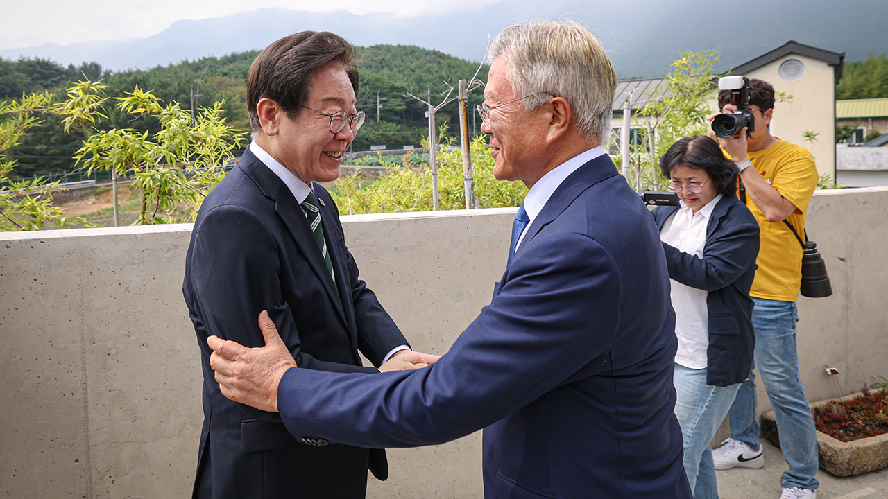 ▲ 문재인 전 대통령이 지난해 9월 8일 오후 경남 양산 평산마을 사저를 예방한 더불어민주당 이재명 대표(왼쪽)와 악수하고 있다.