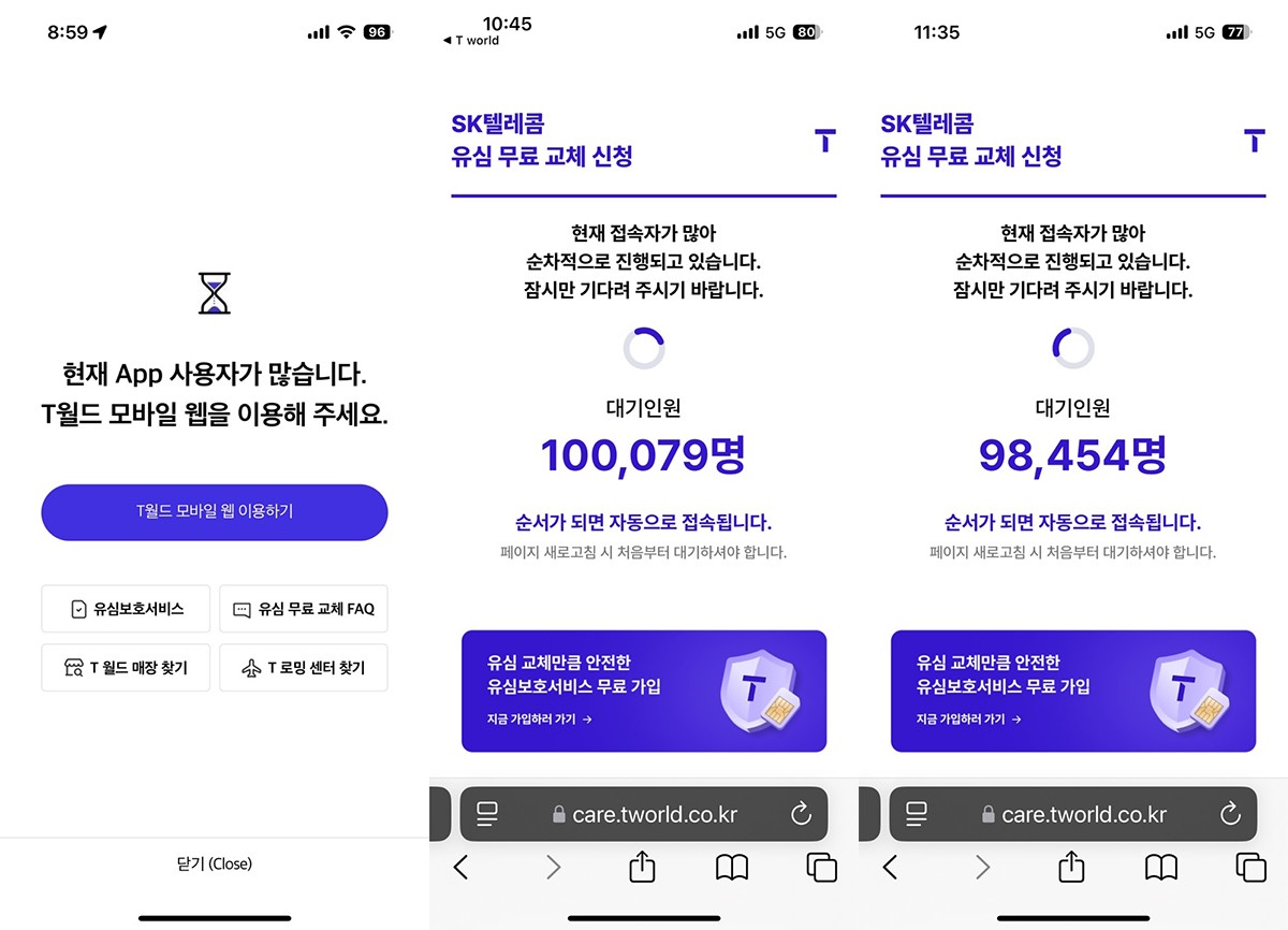 이에 SK텔레콤은 웹 등을 통해 ‘유심 교체 신청 예약’ 신청을 받고 있다. 하지만 이 역시도 원활히 진행되지 않아 가입자들의 원성을 사고 있다.