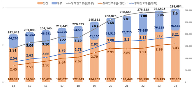 고용노동부가 28일 발표한 ‘2024년 장애인 의무고용 현황’을 보면, 지난해 말 기준 장애인 고용률은 전년 대비 0.04%포인트 오른 3.21%로 집계됐다. 부문별로 보면 공공부문과 민간부문 모두 0.04%포인트 상승해 각각 3.9%, 3.03%를 기록했다. 하지만 공공부문을 뜯어보면 공공기관은 0.15%포인트 올랐지만, 정부부문 장애인 공무원과 공무직 근로자는 0.01~0.02%포인트 하락했다.