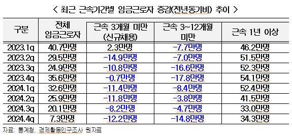 신규채용이라 볼 수 있는 근속 3개월 미만 임금근로자 수가 2023년 1분기 이후 7분기 연속 줄어든 것으로 조사됐다. 내수부진, 보호무역주의 강화 등 대내외 불확실성 확대와 수익성 저하에 따라 기업의 신규채용 수요가 둔화한 결과로 분석된다.