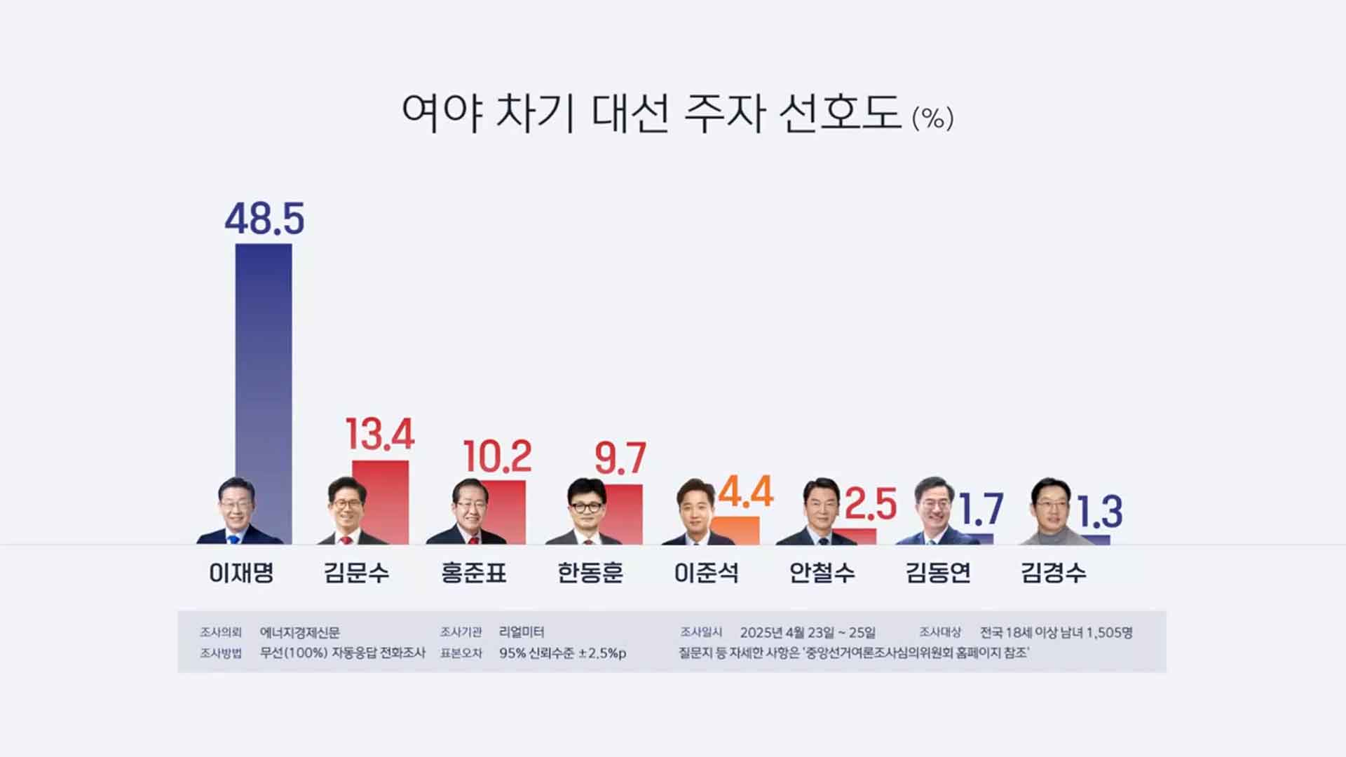 차기 대선 후보 선호도 조사에서 더불어민주당 이재명 후보가 48.5%로 1위를 차지했다는 여론조사 결과가 나왔습니다.