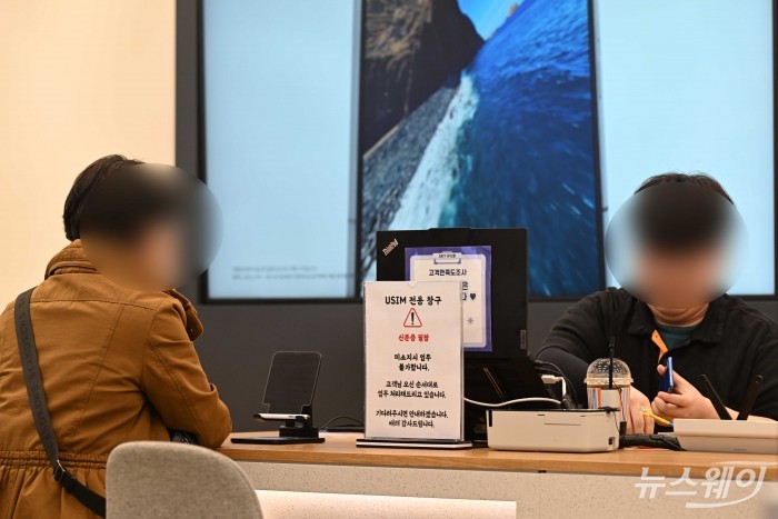 최근 대규모 해킹 공격으로 인해 가입자 유심(USIM) 정보가 탈취된 SK텔레콤(=SKT)이 28일 오전 서울 시내 한 SKT 대리점에서 이용자에게 무료 유심 교체를 하고 있다. 사진=강민석 기자 kms@newsway.co.kr |