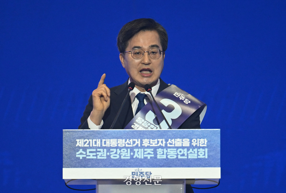 김동연 더불어민주당 대선 경선 후보가 지난 27일 오후 경기 고양시 킨텍스에서 열린 더불어민주당 제21대 대통령선거 후보자 선출을 위한 수도권·강원·제주 합동연설회에 참석해 정견발표를 하고 있다. 국회사진기자단 |