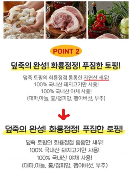 실제로 더본코리아의 덮죽 제품 상세 페이지에는 '국내산'이나 '자연산 새우'라는 문구가 적혀 있지만, 실제 제품 원재료명에는 베트남산으로 표기돼 있었다. 베트남산 새우는 통상 양식 새우인 점이 알려지며 논란은 더 커졌다. 더본코리아는 고발이 제기되기 전 해당 광고 문구를 수정했다.