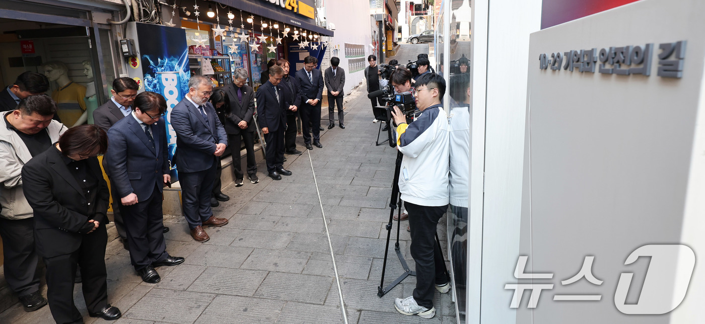 (서울=뉴스1) 박지혜 기자 = 송기춘 이태원참사 특조위원장과 신규 임용 조사관들이 28일 오후 서울 이태원 해밀톤호텔 옆 '기억과 안전의 길'을 찾아 묵념하고 있다. 이날 특조위는 현장을 찾아 참사에 희생된 영령을 위로하고 진상규명 조사 의지를 다졌다. 2025.4.28/뉴스1