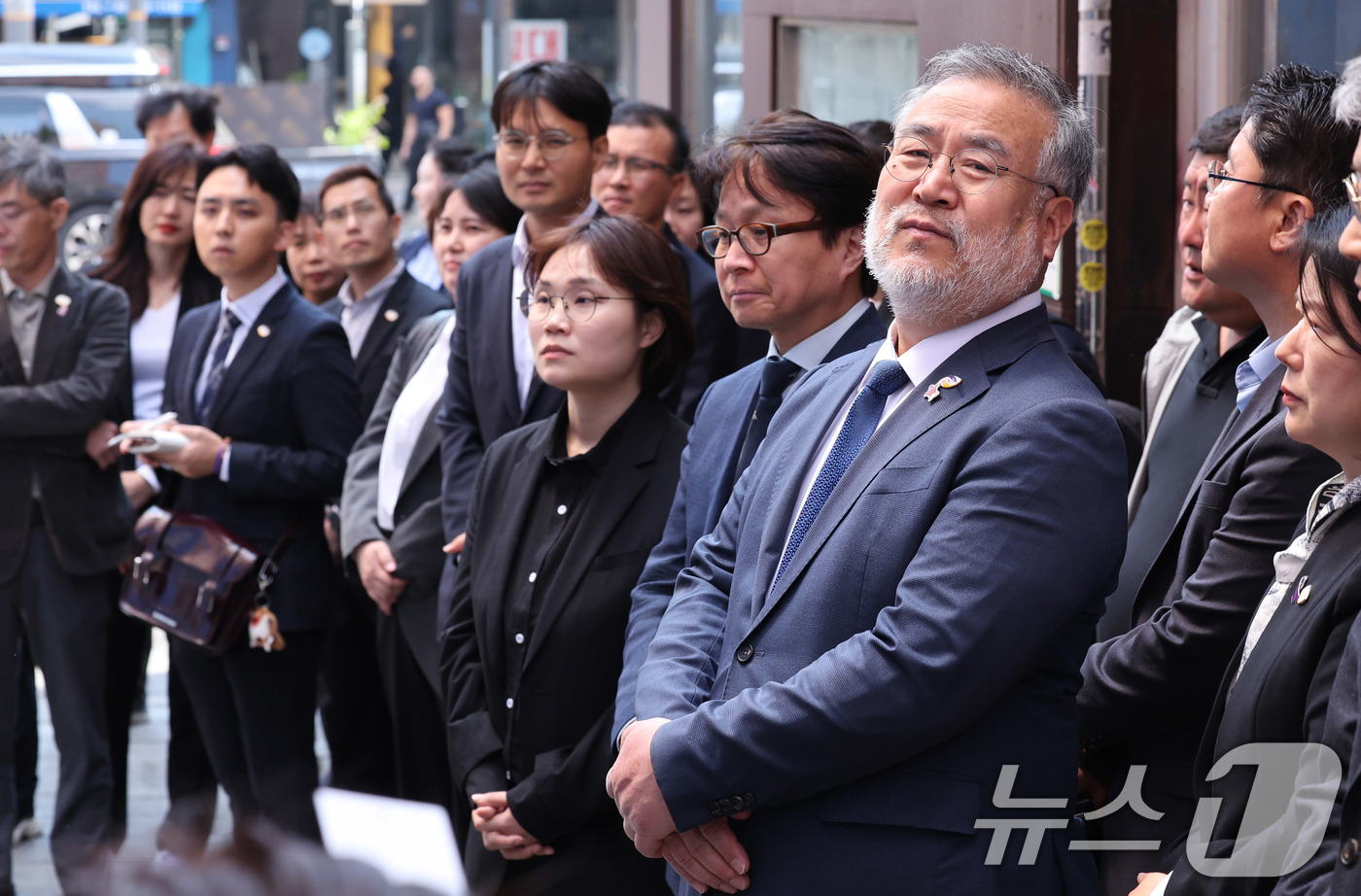 (서울=뉴스1) 박지혜 기자 = 송기춘 이태원참사 특조위원장과 신규 임용 조사관들이 28일 오후 서울 이태원 해밀톤호텔 옆 '기억과 안전의 길'을 둘러보고 있다. 이날 특조위는 현장을 찾아 참사에 희생된 영령을 위로하고 진상규명 조사 의지를 다졌다. 2025.4.28/뉴스1