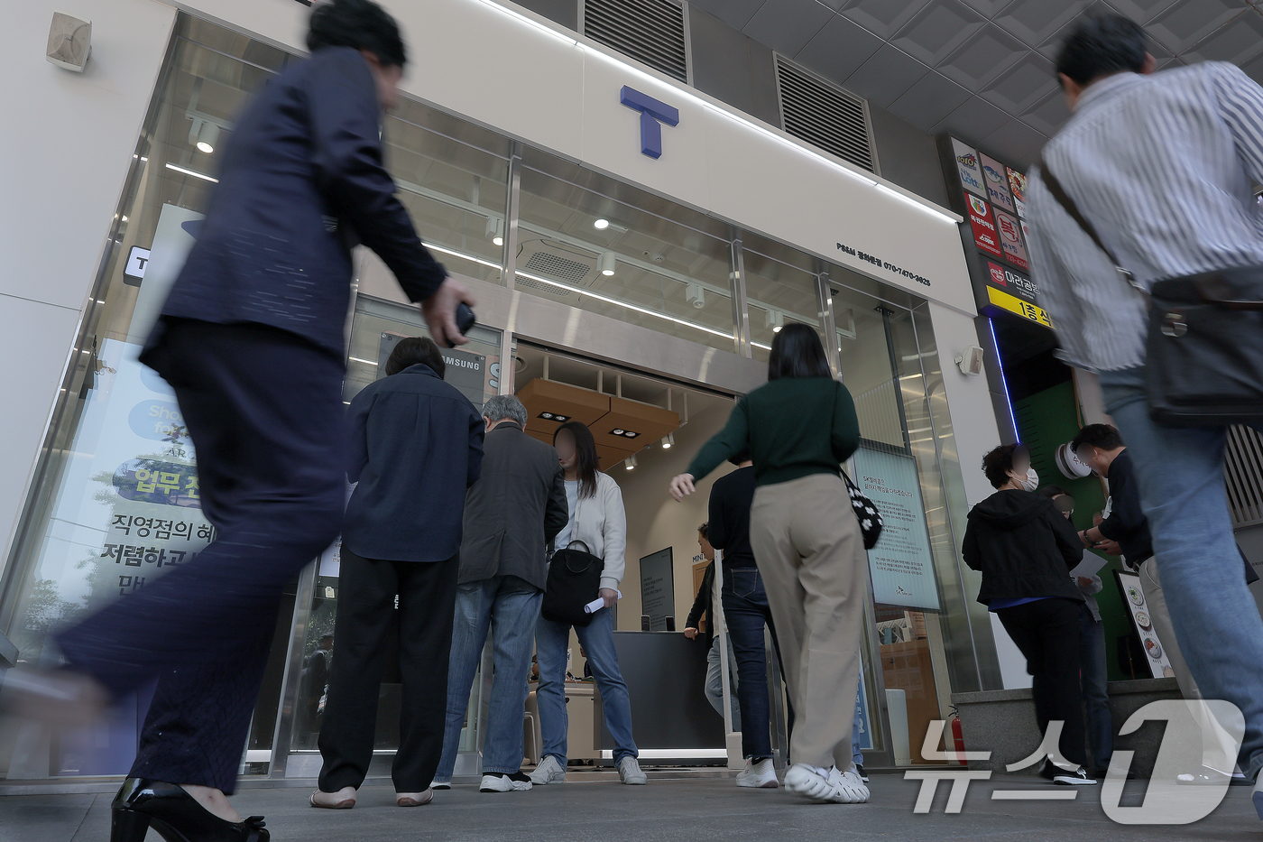 해킹 공격으로 가입자 유심 정보가 탈취된 SK텔레콤이 가입자 유심 무상 교체를 시작한 28일 오전 서울 종로구 T월드 매장 앞에서 고객들이 온라인 예약을 안내 받고 있다. 2025.4.28/뉴스1 ⓒ News1 박정호 기자 |