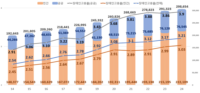 2024년 장애인 고용률은 공공과 민간 평균 3.21%로, 전년 대비 0.04%포인트 올랐다. 장애인 고용인원은 29만8654명으로 전년보다 7331명 증가했다.