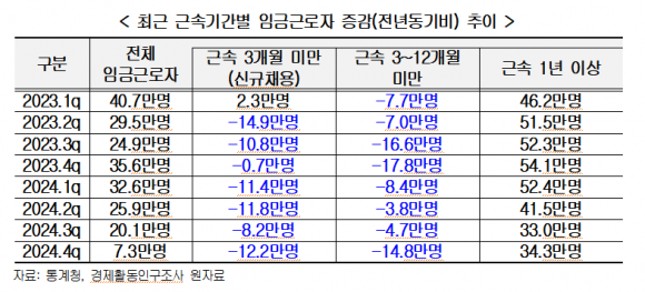 먼저 신규 채용으로 분류되는 근속 3개월 미만 임금근로자 수는 2023년 1분기(2만 3000명 증가) 이후 7분기 연속 감소했다. 2023년 2분기에는 전년 동기 대비 14만 9000명이 줄어들었고 같은 해 3분기에는 10만 8000명, 4분기에는 7000명이 각각 감소했다. 지난해에는 1분기 11만 4000명, 2분기 11만 8000명, 3분기 8만 2000명, 4분기 12만 2000명 등 전 분기에서 감소했다. 이에 따라 졸업을 연기하거나 양질의 일자리가 아니면 취업하지 않는 경향이 높게 나타났다.