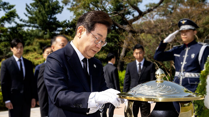 이재명 후보는 민주당 대선후보 선출 뒤 첫 공식 일정으로 전직 대통령 묘역에 참배하기 위해 서울 동작구 국립현충원을 찾았습니다.