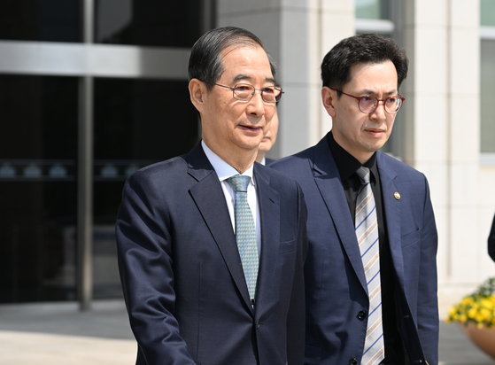 한덕수 대통령 권한대행 국무총리가 지난 24일 오전 2025년도 제1회 추가경정예산안에 대한 시정연설을 마치고 서울 여의도 국회를 나서고 있다. 오른쪽은 28일 사의를 표명한 손영택 전 국무총리 비서실장. 국회사진기자단 |
