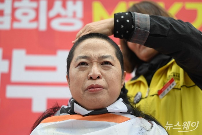 안수용 홈플러스 지부장이 지난 14일 오후 서울 종로구 MBK파트너스 앞 인근에서 진행된 'MBK가 책임져라 확대간부 결의대회'에서 삭발식을 하고 있다. 사진=강민석 기자 kms@newsway.co.kr |