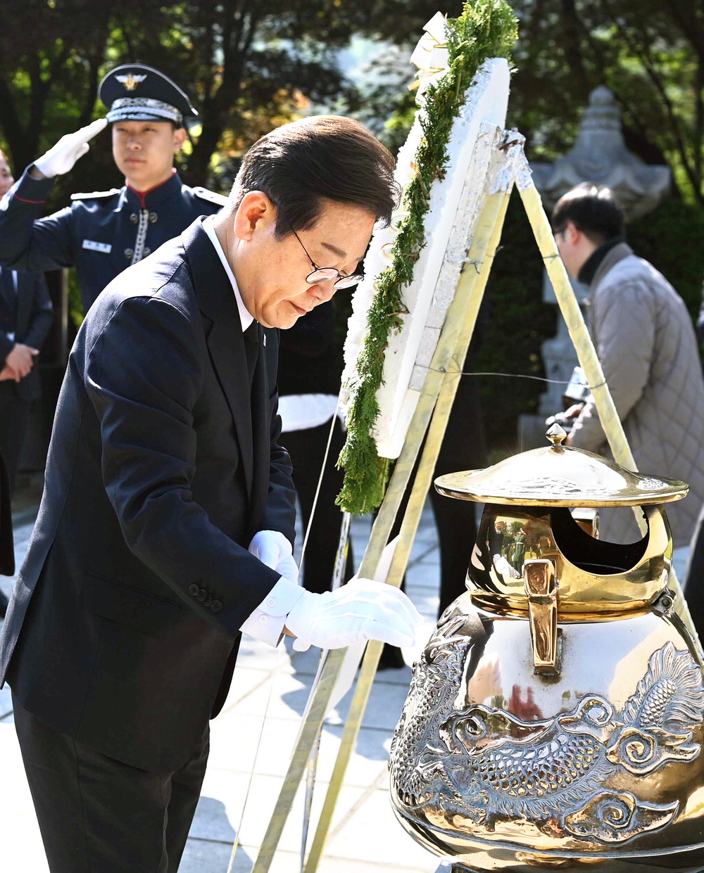 이재명 더불어민주당 대선 후보가 경선 이튿날부터 '우(右)클릭' 광폭 행보를 이어갔다. 이 후보는 28일 오전 서울 동작동 국립현충원을 찾아 이승만·박정희·김대중·김영삼 전 대통령 묘역을 잇달아 참배했다. 애초 예정에 없었던 박태준 포스코 명예회장 묘역도 들러 보수 진영까지 아우르겠다는 의지를 내비쳤다.