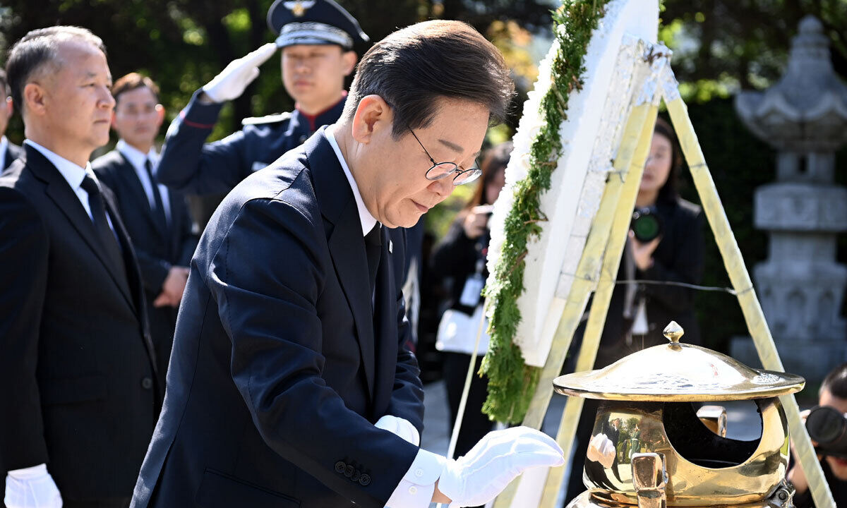이재명 더불어민주당 대선 후보가 28일 오전 서울 동작구 국립서울현충원 고 이승만 전 대통령 묘역을 찾아 참배하고 있다. 공동취재 |
