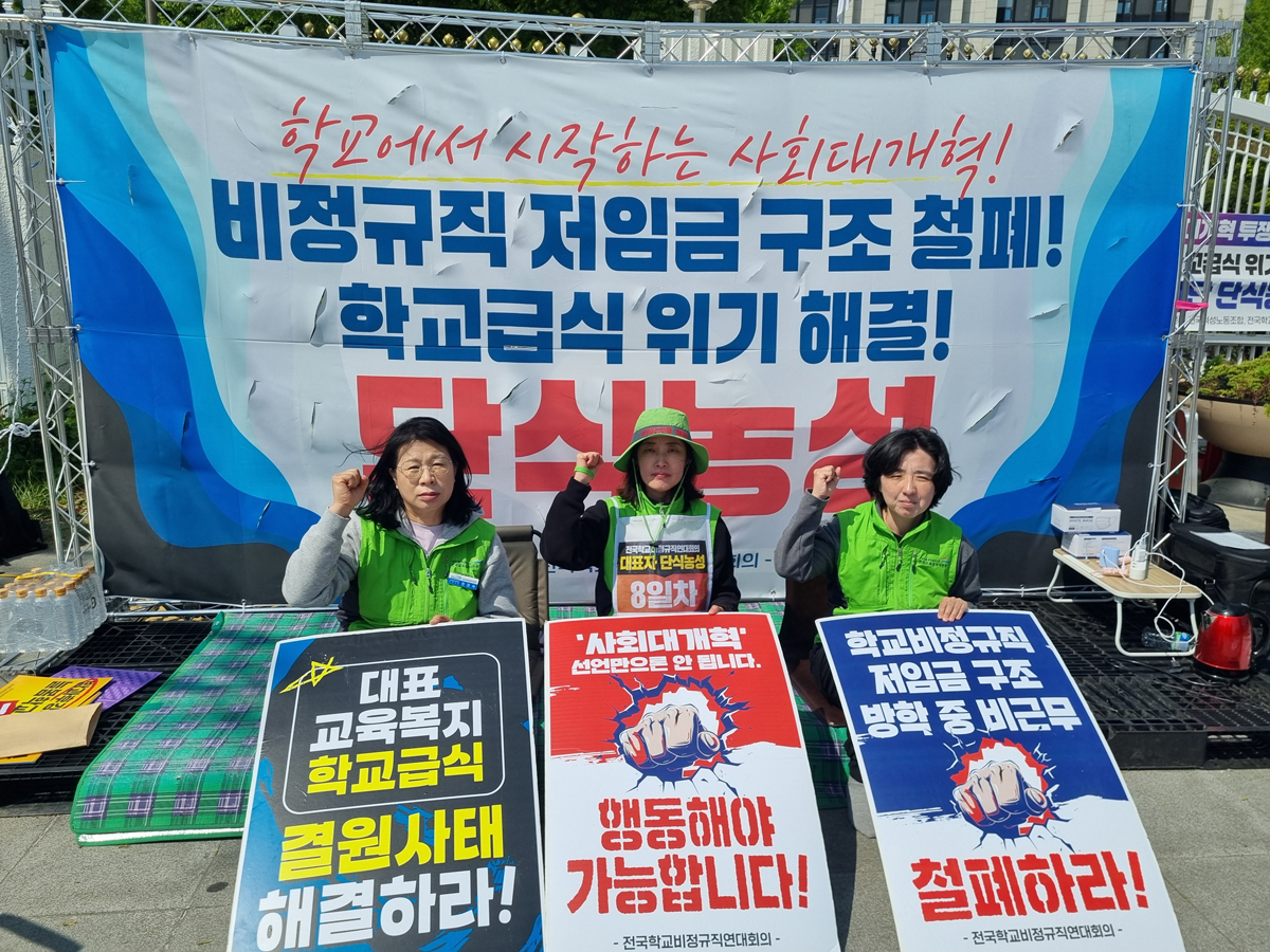 전국학교비정규직노조, 전국교육공무직본부, 전국여성노조 등으로 구성된 연대회의 대표단은 21일부터 정부서울청사 앞에서 단식농성에 돌입해 이날로 8일째를 맞았다. 릴레이 단식투쟁은 전국으로 확산하고 있다. 24일에는 전북과 전남, 25일에 제주와 울산 지역 급식 노동자들이 투쟁에 합류했다.