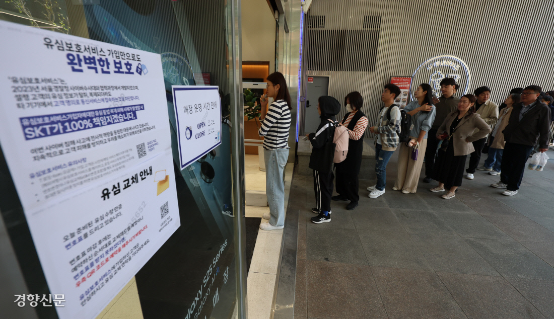 내 차례는 언제? 가입자 유심(USIM) 정보가 유출된 SK텔레콤이 무상 유심 교체를 시작한 28일 서울 종로구 한 SKT 직영 매장 앞에 유심을 교체하려는 고객들이 영업 시작 전부터 줄을 서 있다. 한수빈 기자 subinhann@kyunghyang.com |