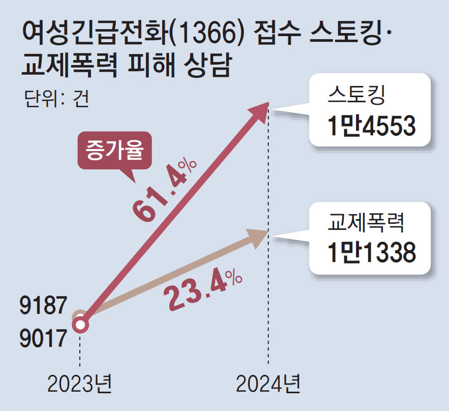 여가부 관계자는 “2023년 7월 스토킹 방지법이 시행되는 등 스토킹, 교제 폭력 등에 대한 사회적 인식이 변화하면서 지난해 상담을 원하는 피해 여성도 늘었다”고 말했다.