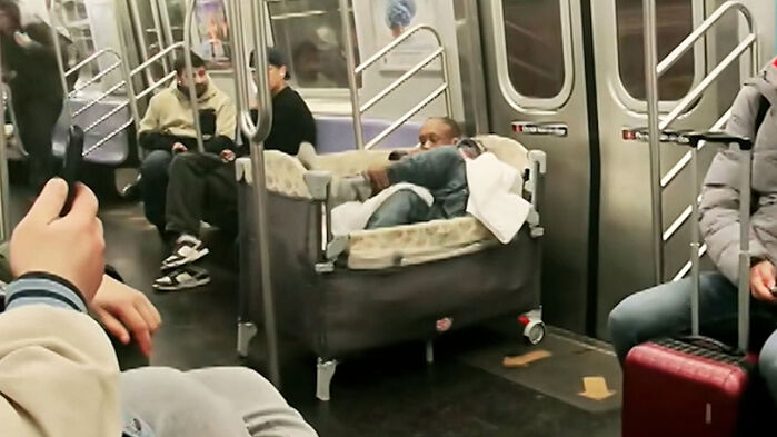 이내 아기 침대 안에서 숙면에 든 남자의 모습에 주변 승객들은 혼란스러운 표정을 숨기지 못했는데, 이 황당한 상황이 정확히 어느 지하철 노선에서 발생했는지는 아직 밝혀지지 않았습니다.