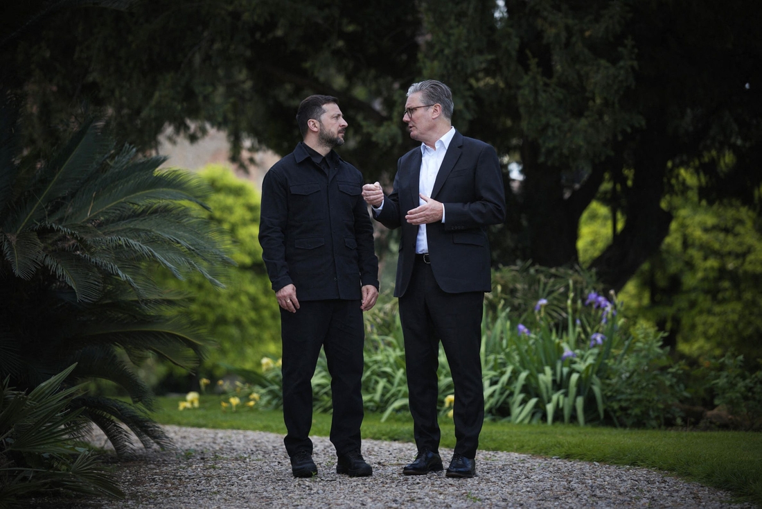 26일(현지시간) 프란치스코 교황 장례미사 참석차 이탈리아 로마를 찾은 키어 스타머 영국 총리(오른쪽)와 볼로디미르 젤렌스키 우크라이나 대통령이 회담하고 있다. 영국 총리실 제공 | AFP연합뉴스 |