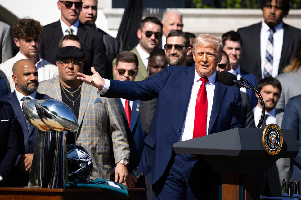 도널드 트럼프 대통령이 28일 워싱턴디시(D.C.) 백악관 사우스론에서 열린 2025년 슈퍼볼 챔피언 이글스를 기념하는 행사에서 연설하고 있다. 워싱턴/UPI 연합뉴스 |
