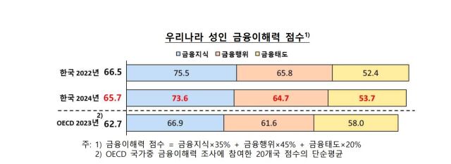한국은행과 금융감독원이 29일 발표한 ’2024 전국민 금융이해력 조사’에 따르면 지난해 우리나라 성인의 금융이해력 점수는 65.7점로 집계됐다. 2022년(66.5점)에 비해 소폭 하락했으나, OECD 평균(2023년 기준, 62.7점)보다는 높다.