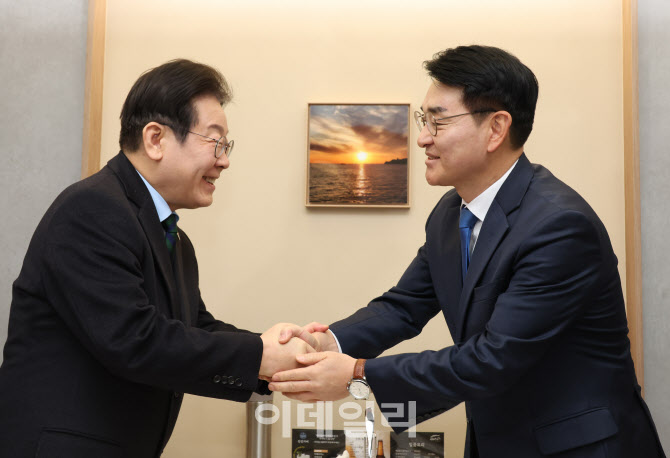 이재명 더불어민주당 대표와 박용진 전 의원이 2월 21일 서울 여의도의 한 식당에서 만나 악수를 하고 있다.(사진=이데일리 노진환 기자) |