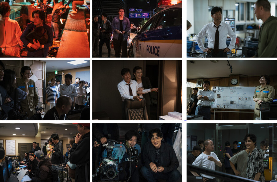 또한 나란히 앉아 촬영 장면을 모니터링하고 있는 강하늘과 박해준의 스틸에서는 훈훈한 브로맨스 케미, 쉬는 시간 황병국 감독과 편하게 이야기를 나누고 있는 박해준의 모습에는 여유로움이 느껴져 시선을 사로잡는다. 캐릭터에 완벽하게 몰입한 채 진지하게 화면을 응시하고 있는 류경수는 연기를 향한 열정이 가득한 본업 모먼트를 보여주고 있으며, 카메라를 향해 브이 포즈를 취하는 채원빈을 포착한 스틸은 캐릭터와 180도 다른 반전 매력을 담았다. 웃음과 열정이 가득했던 '야당' 촬영 현장의 생생한 순간들은 영화에 대한 궁금증과 기대를 더욱 높이며 N차 관람 열기를 더한다.